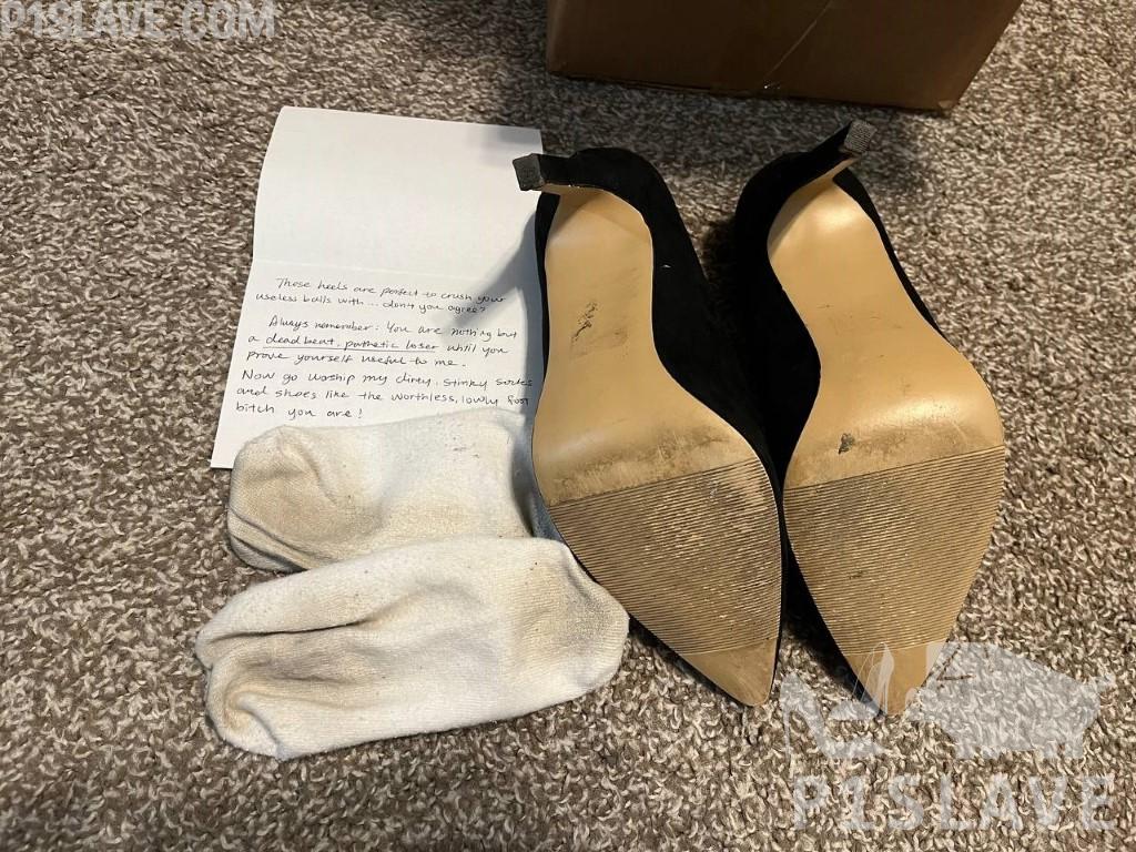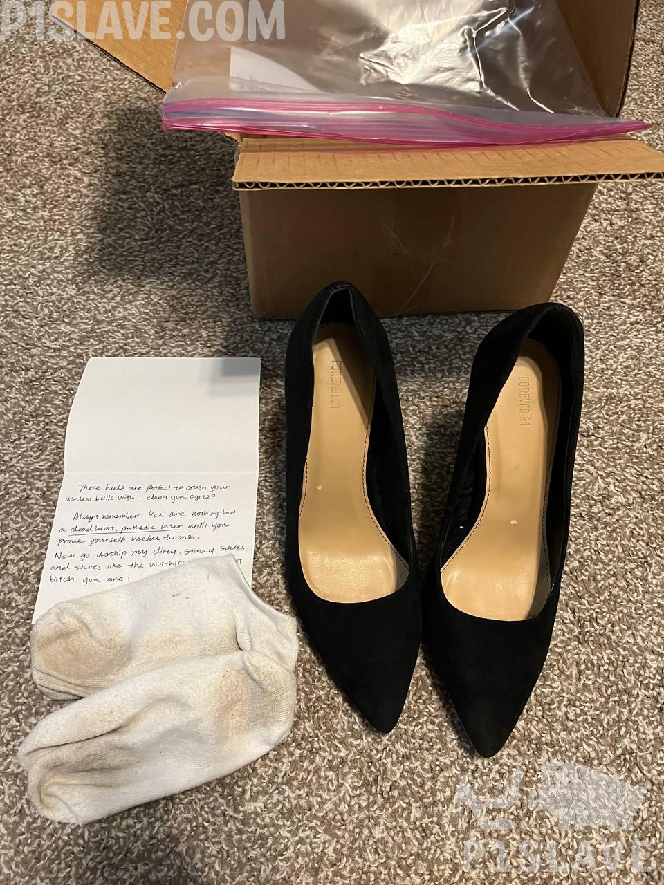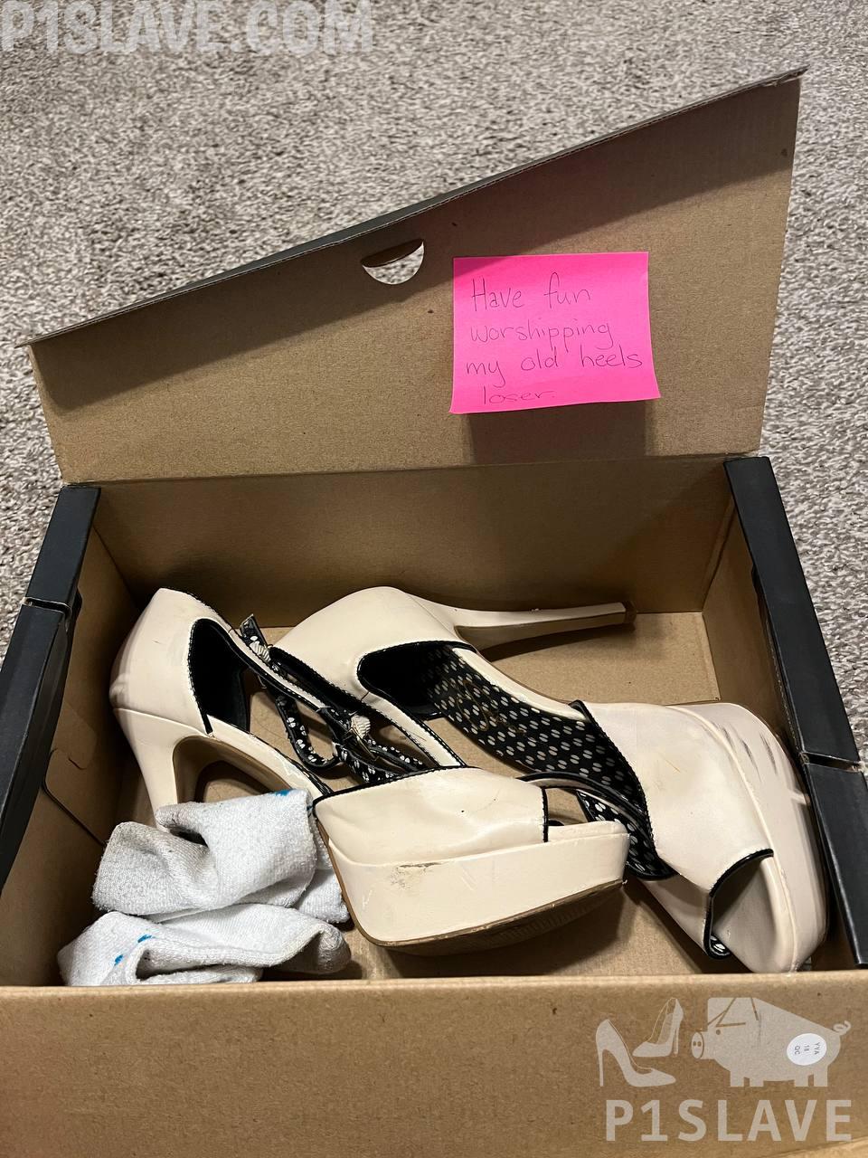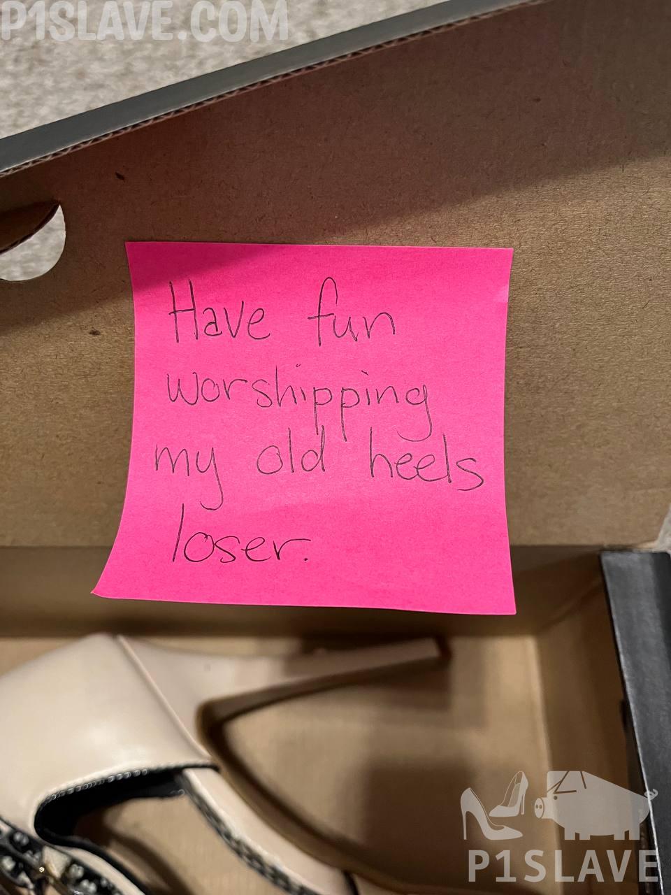 她是个本地的大学生同时在酒吧兼职的,也是个亚欧混血的。疫情期间没机会见面,等疫情结束我想见面的时候她已经隐退了,账号清空也不再回复私信,还挺可惜的。当时还在亚马逊上给她买过一双低跟的皮靴,也就80刀左右的那种便宜货,她拍了个视频给我看,平时也会给我发一些日常的语言羞辱。后来终于在圣诞节前后买了她穿过的高跟凉鞋和棉袜,看聊天记录可以知道她的裸足还挺好看的,并且她说给我的这双她已经穿了7年了。因为疫情加上对我一个陌生人也不放心,她当时就把一个鞋盒放在附近的公园让我去拿,我怀着激动的心情取了回来迫不及待地把头埋进了鞋盒,味道非常棒特别是白色棉袜的味道,高跟鞋上面还隐约有脚趾印,只不过凉鞋味道散的比较快,现在味道就比较淡了。鞋盒上放了一个粉红的便签写着:好好拿去玩和崇拜我的高跟鞋吧,可悲的失败者。简单的一句话就让我在地上要犯贱抽搐了。