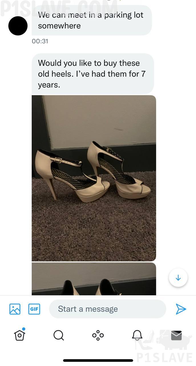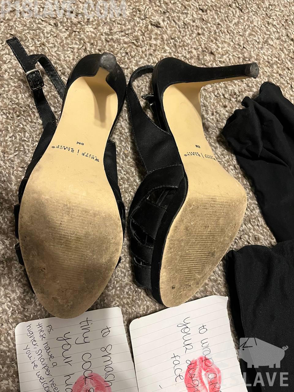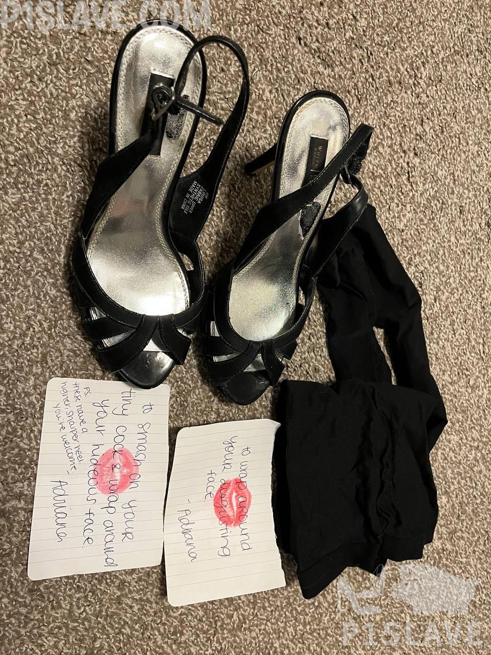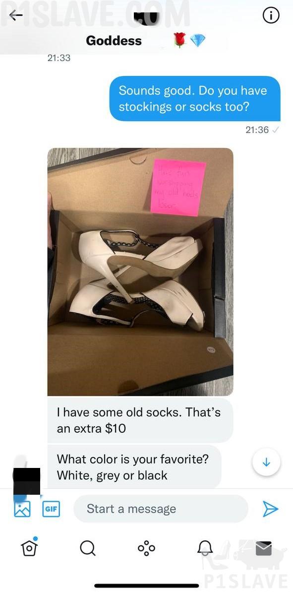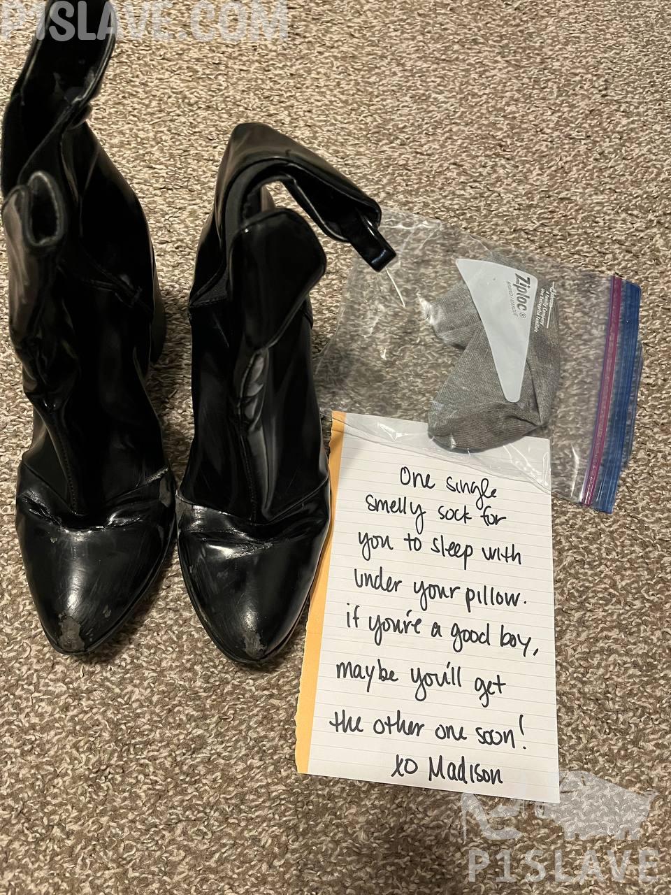 她是个本地的大学生同时在酒吧兼职的,也是个亚欧混血的。疫情期间没机会见面,等疫情结束我想见面的时候她已经隐退了,账号清空也不再回复私信,还挺可惜的。当时还在亚马逊上给她买过一双低跟的皮靴,也就80刀左右的那种便宜货,她拍了个视频给我看,平时也会给我发一些日常的语言羞辱。后来终于在圣诞节前后买了她穿过的高跟凉鞋和棉袜,看聊天记录可以知道她的裸足还挺好看的,并且她说给我的这双她已经穿了7年了。因为疫情加上对我一个陌生人也不放心,她当时就把一个鞋盒放在附近的公园让我去拿,我怀着激动的心情取了回来迫不及待地把头埋进了鞋盒,味道非常棒特别是白色棉袜的味道,高跟鞋上面还隐约有脚趾印,只不过凉鞋味道散的比较快,现在味道就比较淡了。鞋盒上放了一个粉红的便签写着:好好拿去玩和崇拜我的高跟鞋吧,可悲的失败者。简单的一句话就让我在地上要犯贱抽搐了。
