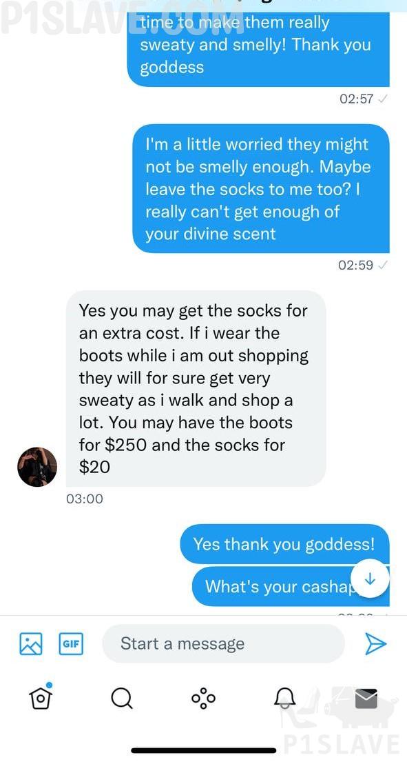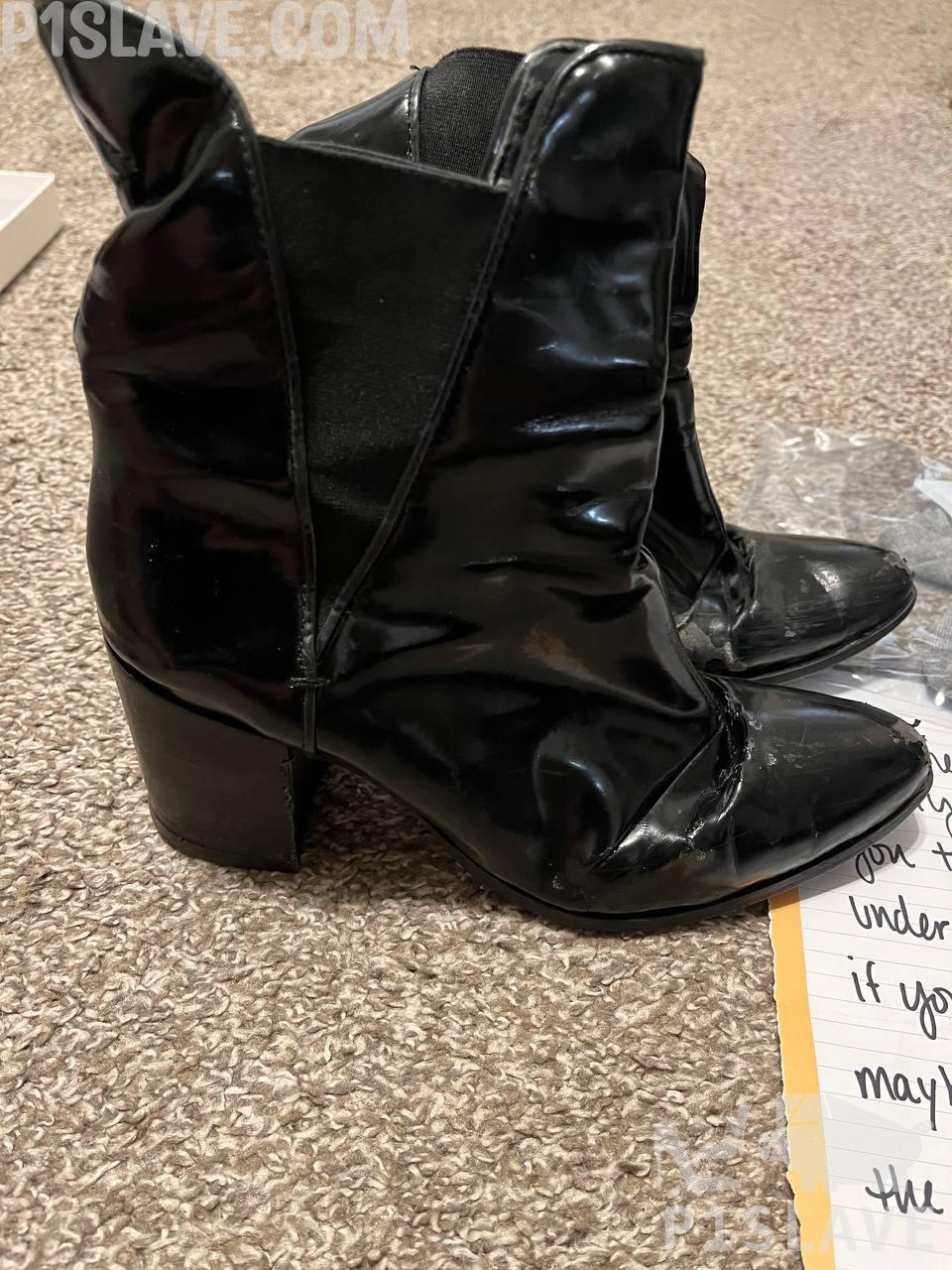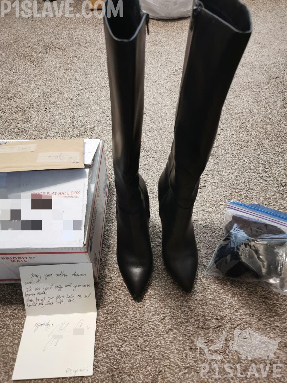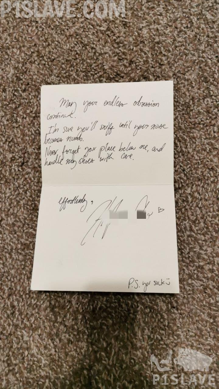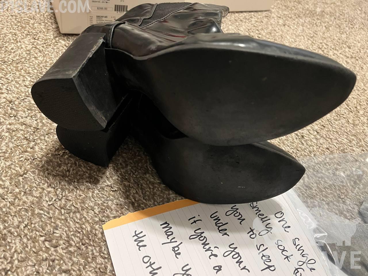 一年后作为回头客我又找她买了一双皮靴和丝袜,我还拍了一个开箱视频显得更有仪式感,可惜她好像在皮靴里喷了一点香水,我这人比较挑剔,一定要原味没有参杂其他味道的,所以买来玩了一两次就没再玩了,以后买得和她说清楚,我要品尝食材本身的味道而不是加进去大量香料来麻痹我的感官。皮靴加丝袜花了我差不多300美元,还没怎么用过,考虑出售给想要的同好,价格你定合适过得去就行,考虑推特上搞个拍卖,得找找有没有方便的软件可以在推特上发个拍卖链接。寄给我包裹里还有她的亲笔信,她的手写还挺好看的,翻译一下就是:我希望你对我无止境的迷恋日渐加深,我很确定你会闻着我的皮靴直到你的鼻子失去知觉。永远不要忘记我比你高贵而你始终在我之下,你要好好爱惜我送给你的皮靴。