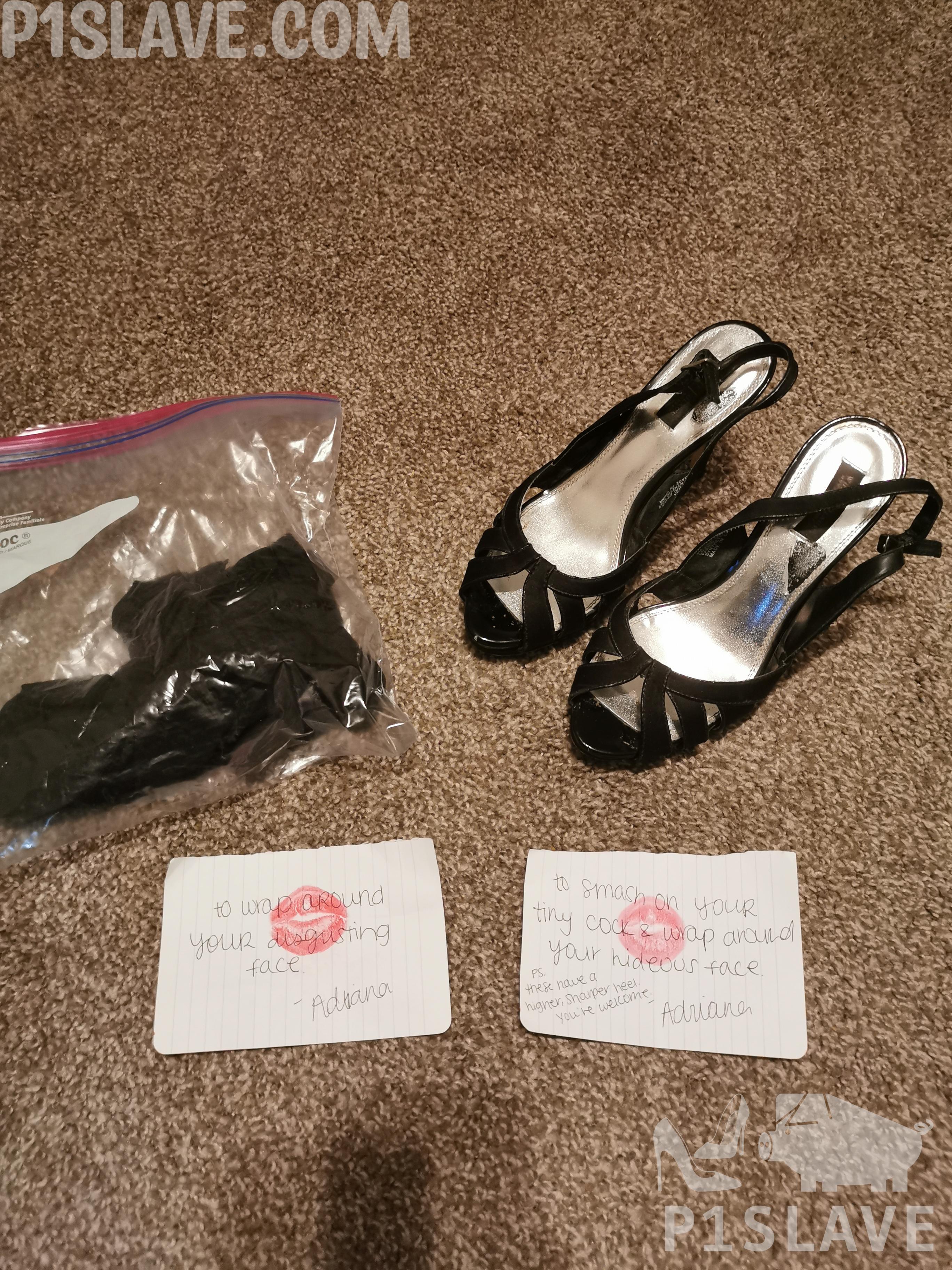 这位女主混血混的有点多,有韩国墨西哥和白人血统,这双买来我就没用过,因为她说好给我寄一双图六里面那双尖头低跟的,但拿到手却是这双黑色的凉鞋,我去质问了她一下还告诉我能给你一双就不错了,我的其他奴收到都很开心,就你挑三拣四,对没信用的女主我就不会再找第二次了。里面有两张带口红印子的纸条,翻译一下就是:把我的裤袜绕在你的脸上去闻,用我的高跟鞋抽你的JB然后在放到你丑陋恶心的脸上去闻。话说回来女主确实长的还挺好看的,既有亚洲人的精致,也有美国人的洒脱和放荡不羁。