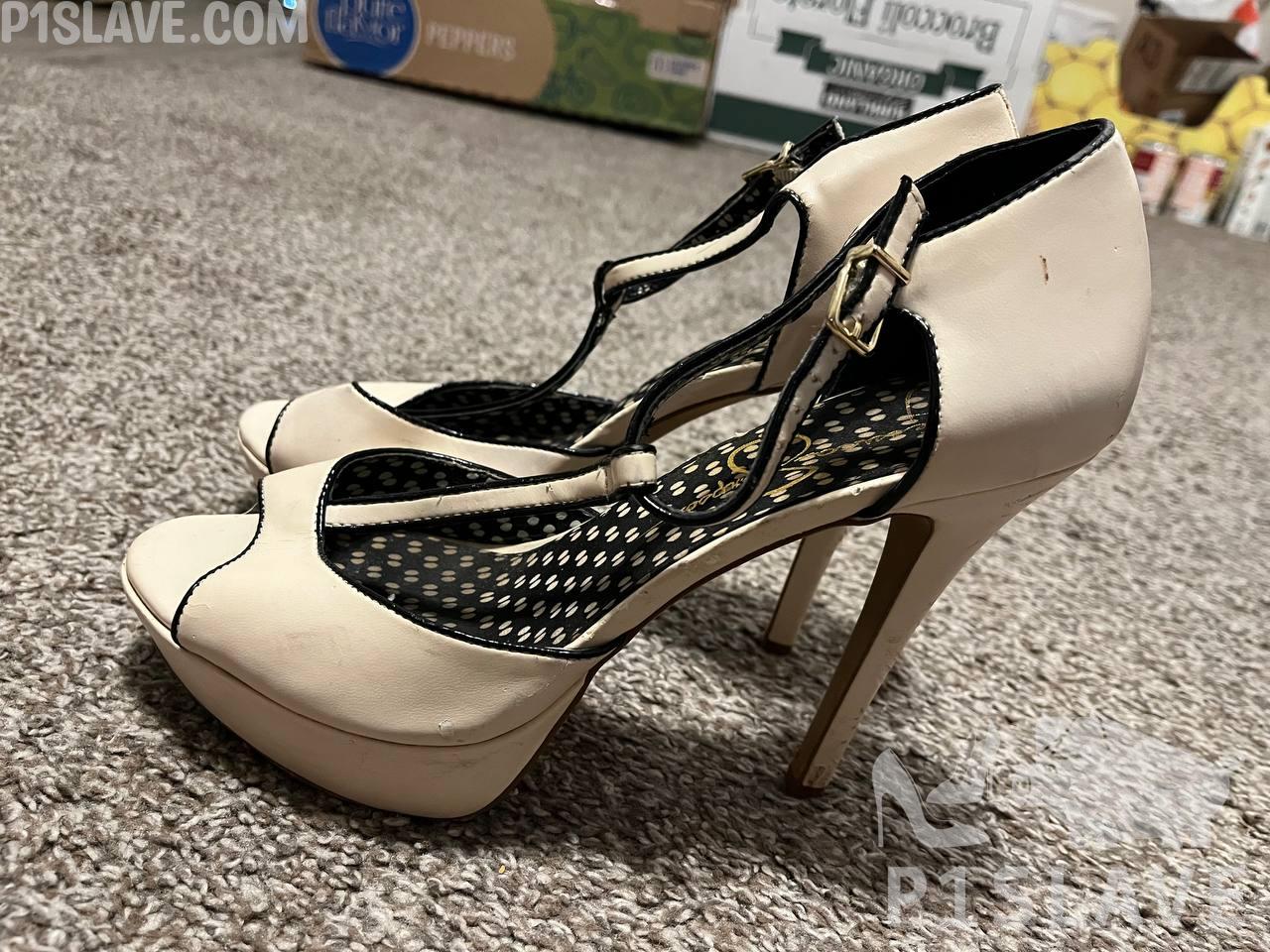 这双高跟鞋是第一集调教文里女主送的,我和她说了我喜欢高跟鞋以后,有一次她突然给我打电话说过来了有双高跟鞋要送给我,那天可能晚饭吃太多了犯困,我9点就睡过去了11点醒来发现错过了她的电话,不过她留了信息说把高跟鞋的袋子放在了我小区的一个位置让我自己去拿,并让我拍一个舔鞋底的视频发给她。我当时大半夜的一个箭步冲出去马上找到了那个袋子,生怕去的晚了被清洁工扔进垃圾车或者被狗叼走了哈哈,我兴奋不已的带回家去享受了,然后按照要求发了舔鞋底的视频发过去,对方很开心然后嘲笑我是多么的可悲。不过这双高跟鞋是圆头的,我并不是特别中意,所以没玩几次就束之高阁了,偶尔拿出来闻一闻提神醒脑。图片合集里面还有一些她发我的其他高跟鞋图片,包括一张拍给我看鞋底的,那个高跟凉鞋的鞋底在那次调教的时候终于舔到了。