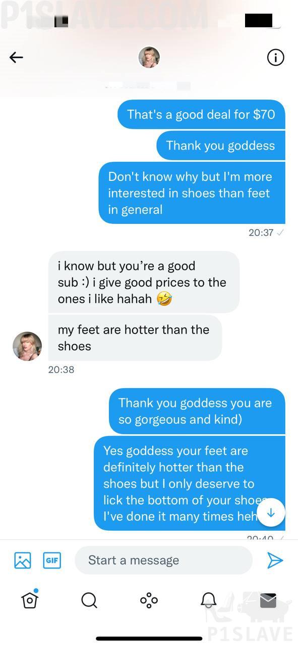 这两位白妹女主很可能会和她们在不久的将来见面,在网上认识了她们也是因为有一次看她们在搞dick ratings活动,也就是你发一张自己JB的照片给她们,付点钱她们会发一个对你JB评价的语言羞辱视频,这可把我激动坏了,赶紧屁颠屁颠发了一张JB看起来都快缩进肚子里的图片和20刀费用,然后就得到了一个一分钟左右的羞辱视频,实在太刺激了当时我就看射了,我之后会发到付费专区给大家学习英语用哈哈。后面就顺利成章的问她们有没有高跟鞋卖,因为其中一个女主说觉得我非常幽默有趣很会说话让她很开心,说you are a good sub and I give good prices to the ones I like hahah(你是一个表现很好的奴,我一般会给我喜欢的奴很好的价格甚至白送哈哈哈)于是那天70刀买了两双鞋加两双棉袜!两双鞋都来自于那个娇小一点的女主,一双是板鞋,另外一双是高跟凉鞋上面还有非常清晰的脚趾印子,然后她们俩还每人给了我一双棉袜!从来没有拿到过这么优惠的价格,一般来说问网上女主买原味棉袜都要卖30-50刀,鞋子都是100刀起步,我凭着三寸不烂之舌直接地板价拿到一堆好货,开心的简直要晕厥。价格高一点低一点我倒是也无所谓,重要的是能让女主开心对你好印象,那后面做什么事情提什么要求都方便,现在偶尔会聊一下,说以后有机会可以见面,如果我去她们的城市或者她们来我的城市。收到货以后,女主还让我拍一个我舔鞋底的视频让她开心开心,我马上就照做了(聊天截图里有我舔鞋底的照片),鞋子的脚码很小又是36的所以我基本不玩,两双棉袜的味道倒是很棒,我放在密封袋里慢慢享受。